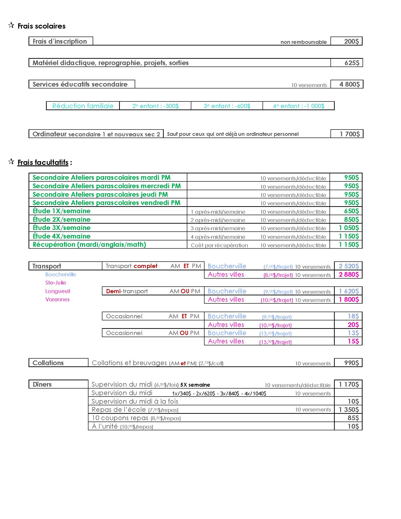 Frais scolaires au secondaire